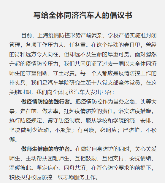 面对上海严峻的疫情防控形势,汽车学院研究生第十八党支部作为教育部第二批全国“百个研究生样板党支部”,积极响应上级党委的号召,充分发挥党组织的政治引领和战斗堡垒作用,凡事想在前、干在头、打出样,引领党员积极投身到学校疫情防控第一线,为嘉定校区疫情防控攻坚战做样板、当表率。