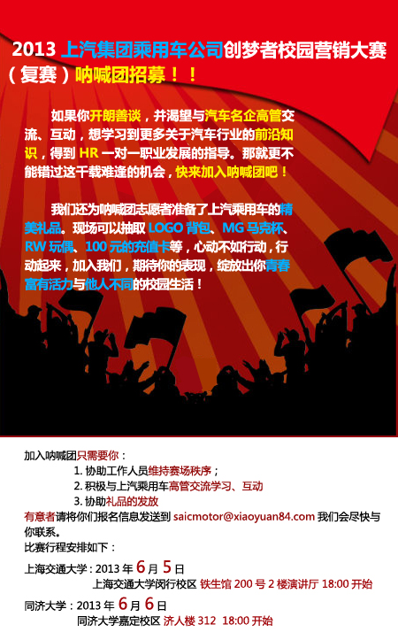 有意者请将你们报名信息发送到saicmotor@xiaoyuan84.com我们会尽快与你联系。