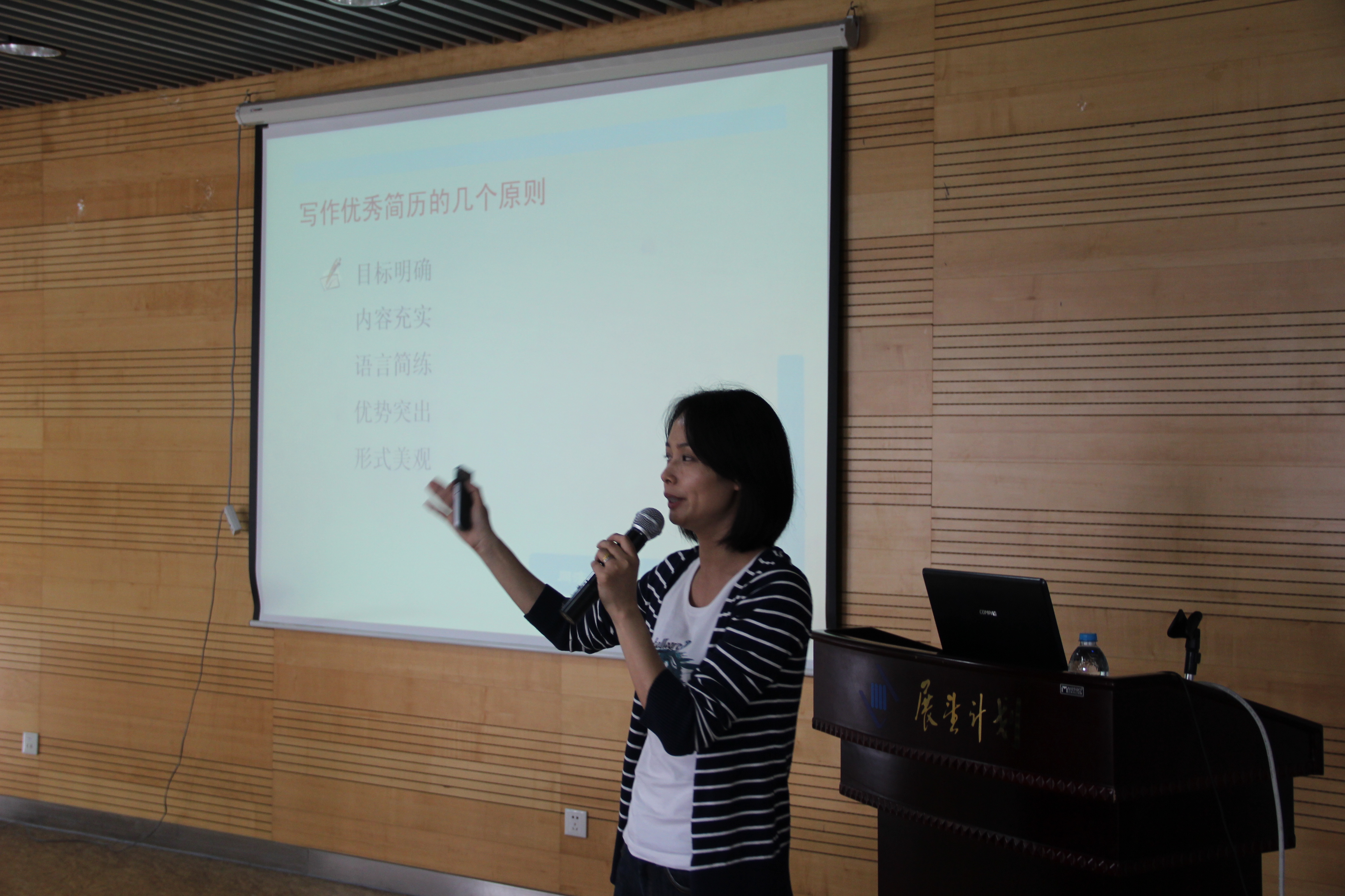 首先,曹静老师对主讲嘉宾朱老师表示热烈欢迎和衷心感谢,并介绍了学院举办此次活动的背景和目的,希望同学们都够珍惜听讲座的机会,通过参加培训增长技能,最终找到满意的工作。接着,朱华珍老师就优秀简历的制作原则、常见错误、简历的结构和形式、简历中的用词技巧等内容结合具体案例做了详细的讲解,并回答了同学们的提问。