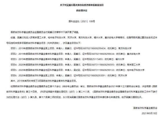 经查,吴冀衍先后入职南京理工大学、桂林电子科技大学、同济大学、南方科技大学、福州大学、重庆邮电大学等高校,在聘用期间通过篡改姓名和证件号码违规申报多项国家自然科学基金项目(均未获资助)。