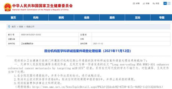2. 2021年11月12日,国家卫健委网站公布了24起机构医学科研诚信案件调查处理结果。所涉论文主要涉及第三方代写代投、伪造实验过程、篡改研究图表等学术等不端行为,共处理78人。给予撤销研究生导师资格,取消5-8年项目申报、立项、评奖、职称晋升等活动资格等处罚。其中,福建省肿瘤医院撤销了通讯作者张晶主持的福建省自然科学基金面上项目(项目编号:2017J01263),按原渠道退回项目结余经费等处罚。