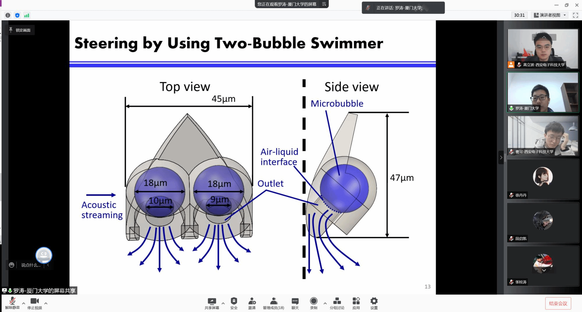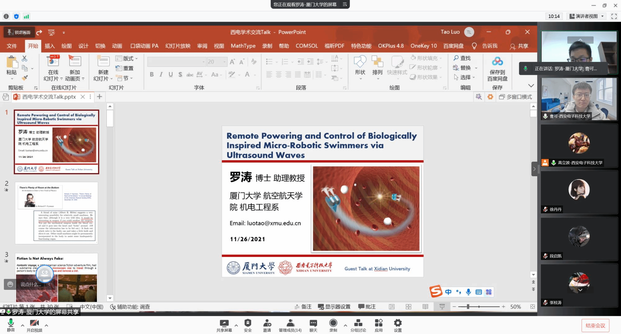 (通讯员 高立波)11月26日上午,应3499cc拉斯维加斯高立波的邀请,厦门大学航空航天学院机电工程系助理教授应邀在线上作了题为《Remote Powering and Control of Biologically Inspired Micro-Robotic Swimmers via Ultrasound Waves》的学术报告。本次报告因疫情原因改为线上,高立波,王明智,曹可等测控系师生参加,高立波副教授主持。