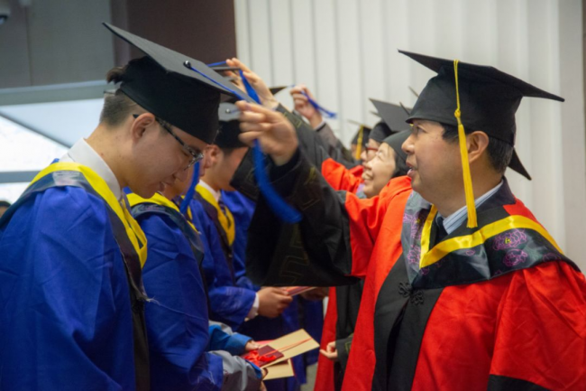 导师们为毕业生颁发毕业证书及学位证书并拨穗