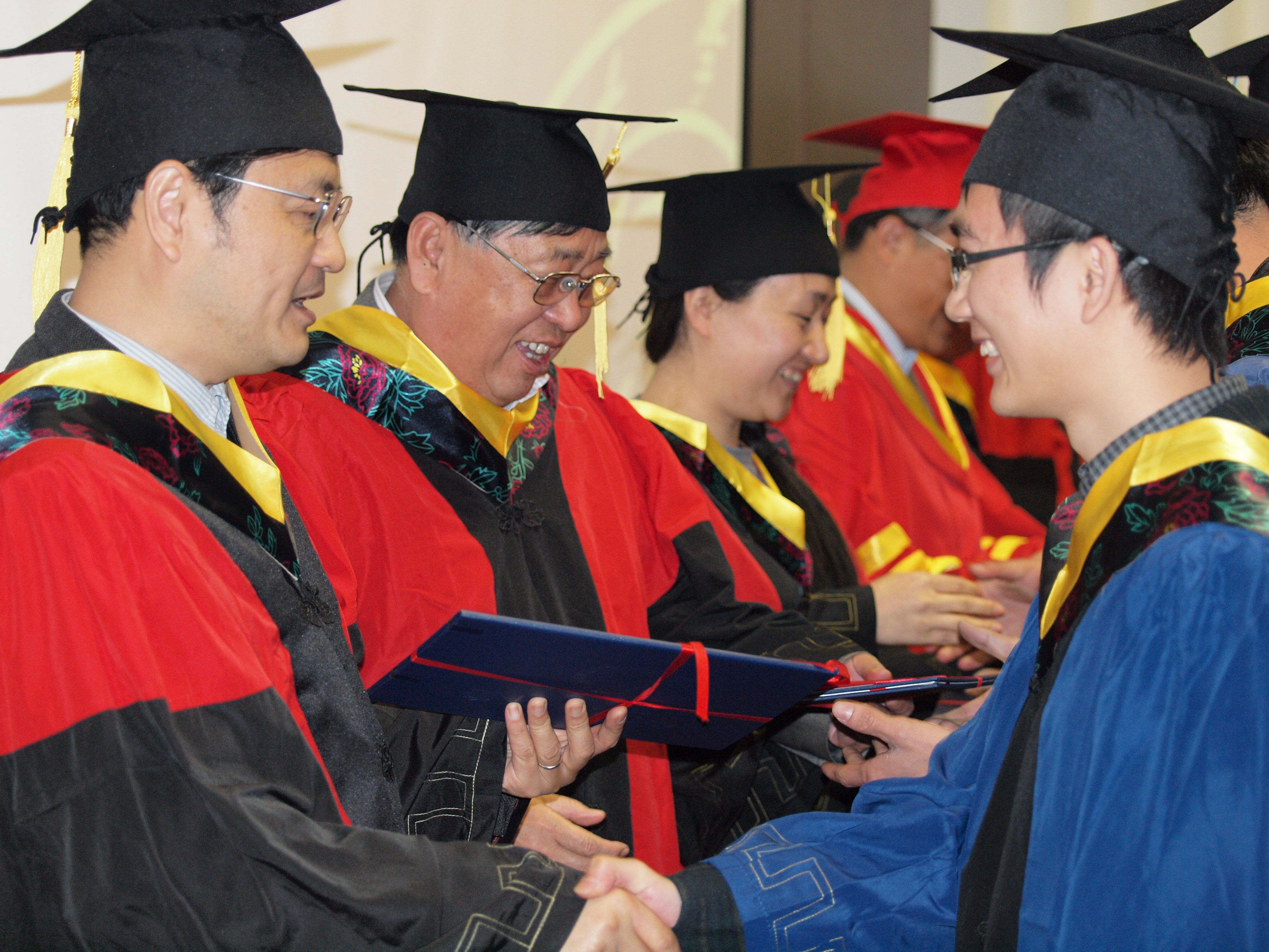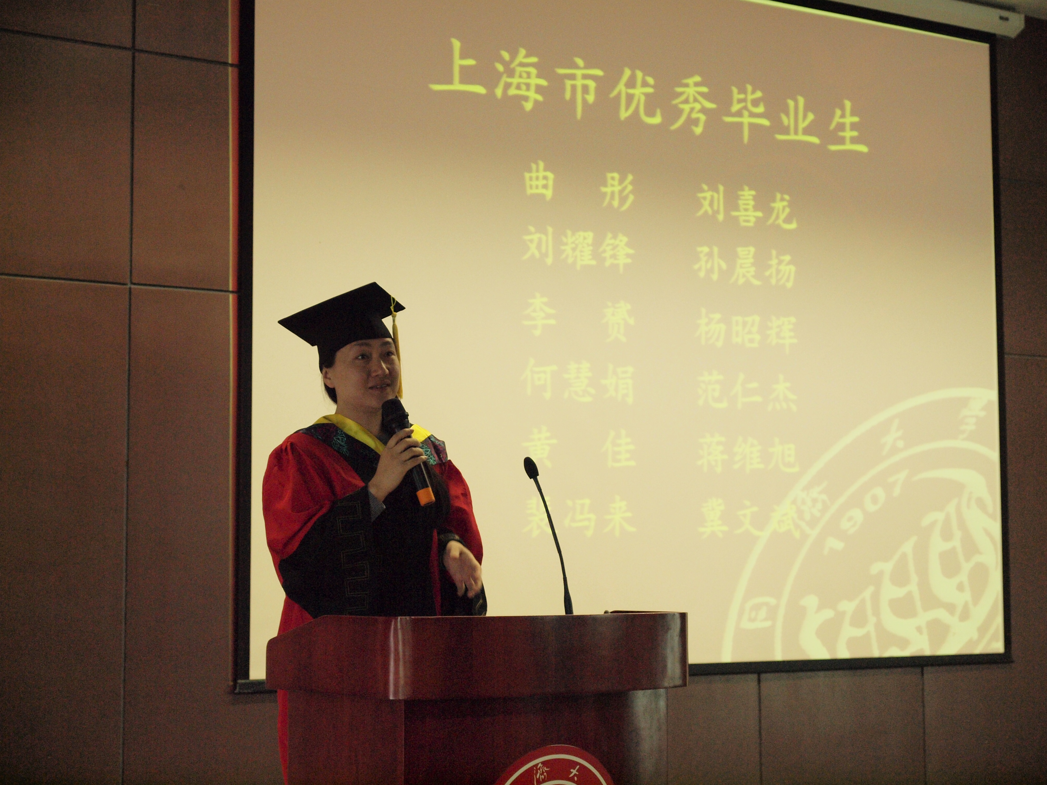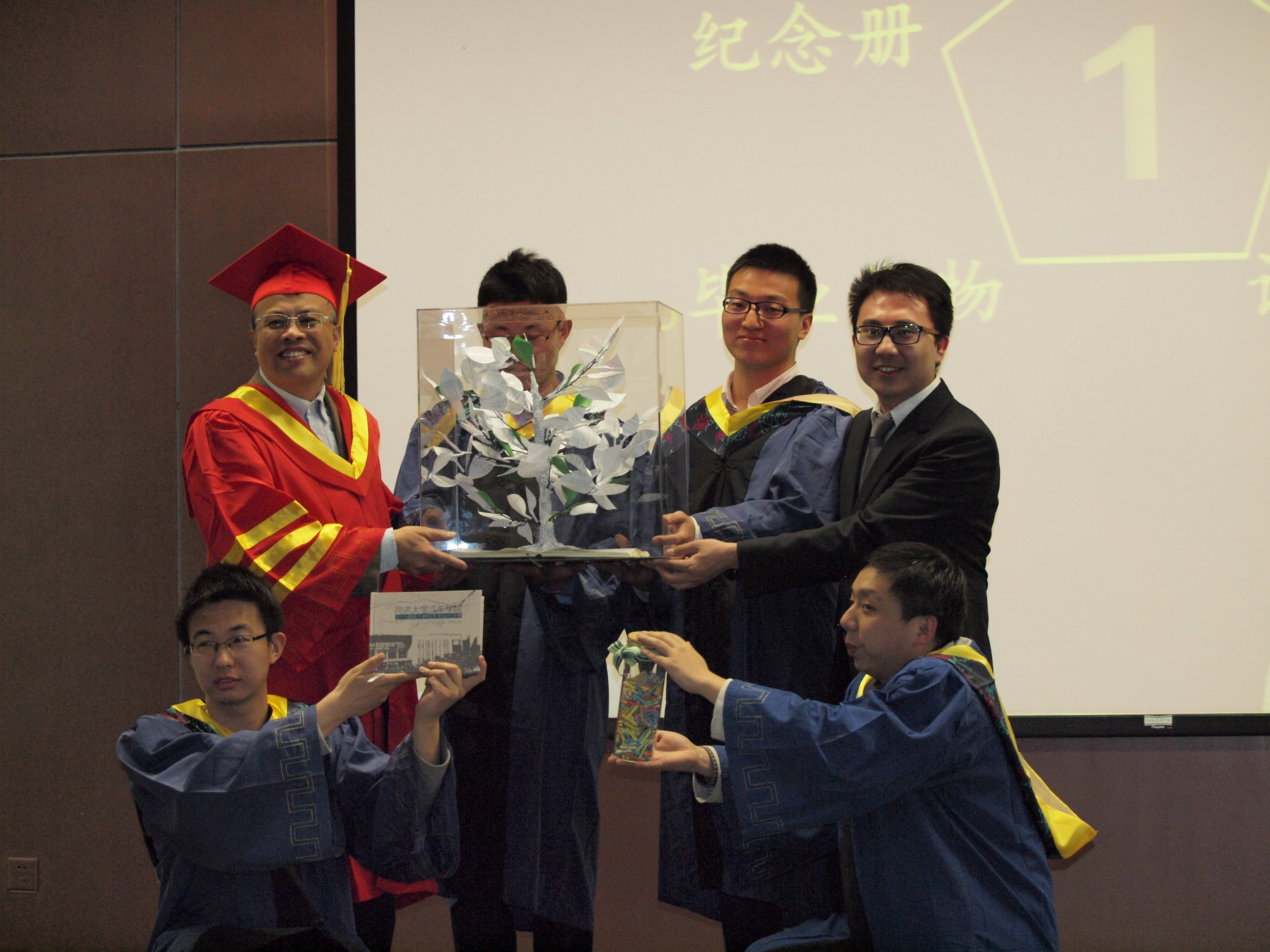 校党委研究生工作部部长陈华对毕业研究生赠与祝福后宣读了优秀毕业生名单,并和孙泽昌教授共同为获奖学生颁发优秀毕业生证书。随后孙泽昌教授作为导师代表发言,在肯定硕士毕业生的学术水平与科研成果的同时,表达了对毕业生的殷切期望。汽车学院党委副书记史成宇老师对学院2015届毕业生的去向作了简要介绍。上海市优秀毕业生李赟同学,作为毕业生代表作发言。他代表全体毕业生对汽车学院的悉心培养表示衷心的感谢,并回忆了自己的学习科研时光,表达了对学院和同学们的深厚感情。随后校友联络人李赟、付喆等人上台向汽车学院献上2015届毕业生送给学院的礼物:一本纪念册、一棵象征共同成长的樱花树、一个心愿瓶、毕业生捐赠的书籍和象征着汽车知识在同济汽车人身上生根发芽的手工艺品“汽车之树”。在全体毕业生和到场家长们的共同见证下,各位教授上台为毕业生拨穗,并颁发毕业证书与硕士学位证书。最后,在慷慨激昂的《同济校歌》中,2015届研究生毕业典礼圆满结束。