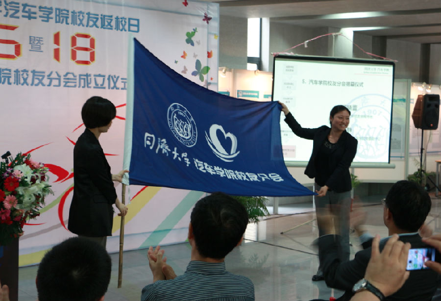 余卓平院长宣布同济大学汽车学院校友分会成立,郑晓蕾老师向曹静老师授校友会旗并一起为汽车学院校友分会揭幕。
