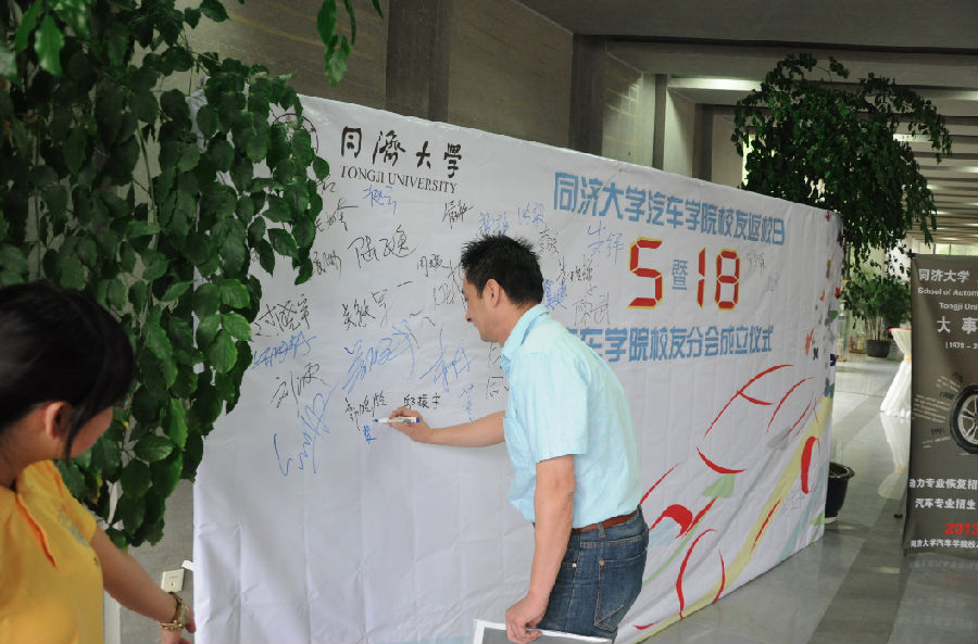 “同谋汽车路,济续母校情”【5·18济得回嘉·同济大学汽车学院校友返校日暨同济大学汽车校友分会成立仪式】今日在同济大学嘉定校区汽车学院(宁远馆)底楼大厅举行。同济大学校长助理、汽车学院院长余卓平教授,同济大学校友会秘书长郑晓蕾老师,汽车学院副院长吴志军教授、汽车学院党委副书记曹静老师等学校、学院老师出席活动。前来参加活动的还有同济大学汽车学院78级至07级的校友以及08级即将毕业的本科生共近二百余人。