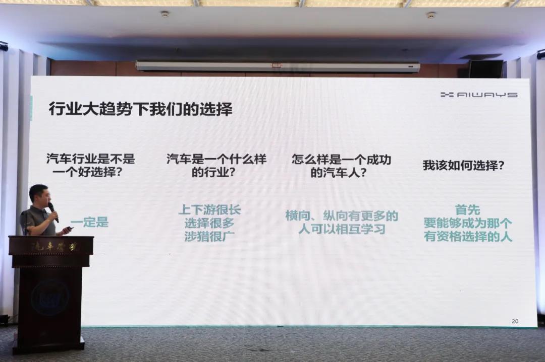 爱驰汽车东区区域总监王丛作题为《汽车行业大趋势下的选择》的分享。他在分享中指出,汽车行业已经脱离了过去简单生产与制造的传统模式,智能网联与电动化、共享化相互融合趋势下催生的汽车生态使汽车产业价值链来到了发生颠覆性改变的时间点,互联和数据将成为未来竞争的核心要素。多样的汽车生态将会给汽车学院的同学们带来更多的选择,王丛鼓励汽车学院的同学们抓住机会、多努力多尝试,在变革的时代中占据主动,为个人和中国汽车行业带来更好的发展。