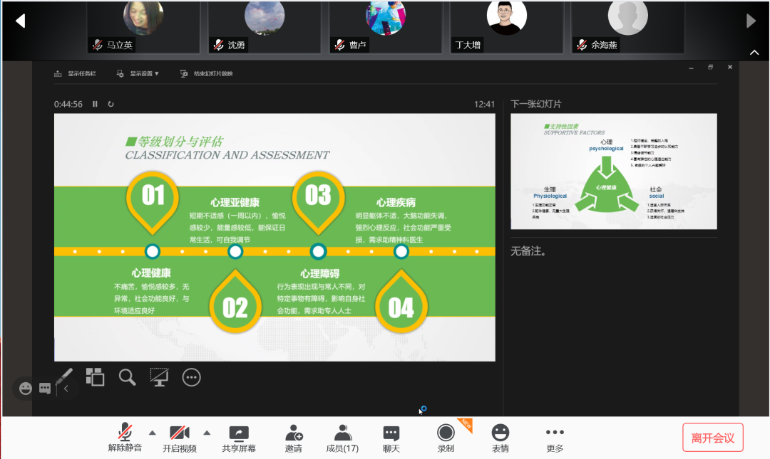 李红老师结合自身工作经验,分享了研究生与导师之间可能会出现的一些问题。她认为,导师应与学生互相接纳,彼此建立信任与安全的关系;与学生建立良好有效的沟通模式,及时帮助学生解决实际困难,关注学生的身心健康。最后,李红老师就常见的心理问题进行了阐述,并就不同情况列举了学生危机状况的系统干预模式。