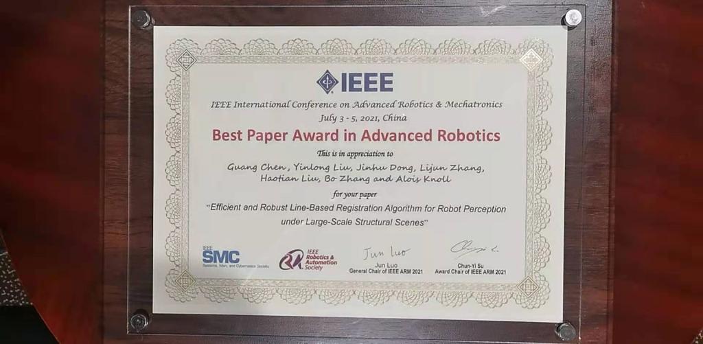同期第六届IEEE先进机器人与机电一体化国际会议(IEEE International Conference on Advanced Robotics and Mechatronics,ICARM 2021)于7月2日至5日在重庆召开,由我院陈广老师课题组联合慕尼黑工业大学和上海西井信息科技有限公司共同完成的论文《Efficient and Robust Line-based Registration Algorithm for Robot Perception Under Large-scale Structural Scenes》被会议接收,并获得最佳先进机器人会议论文奖、会议最佳论文提名奖。该论文提出了一种新型基于线特征的点云配准算法,创造性设计将旋转和平移进行解耦求解的思路,降低了解空间的维度,提升了优化算法的效率,为自动驾驶车辆在结构化场景中的鲁棒感知和自主导航定位提供了新的方案。