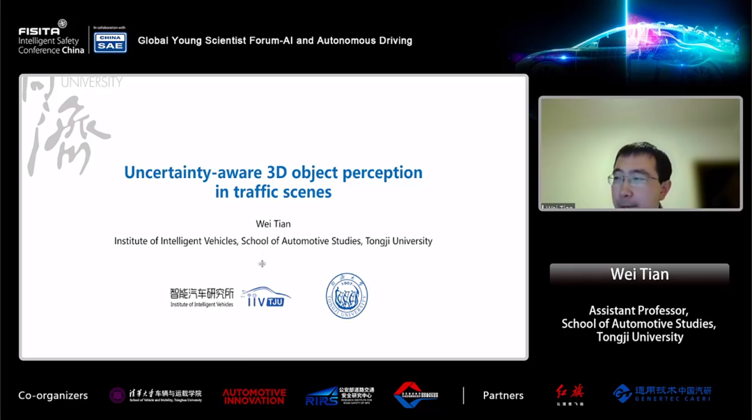 同济大学汽车学院助理教授田炜老师发表了题为"交通场景中考虑不确定性的3D目标检测” 的演讲。通过考虑神经网络的不确定性,讨论了交通环境中的三维物体检测方法。重点介绍了二维视觉表现和三维空间属性之间映射的概率建模及最新研究进展。