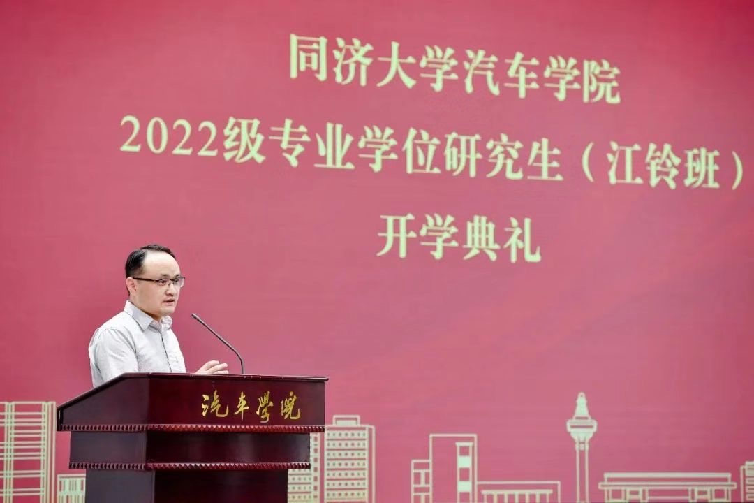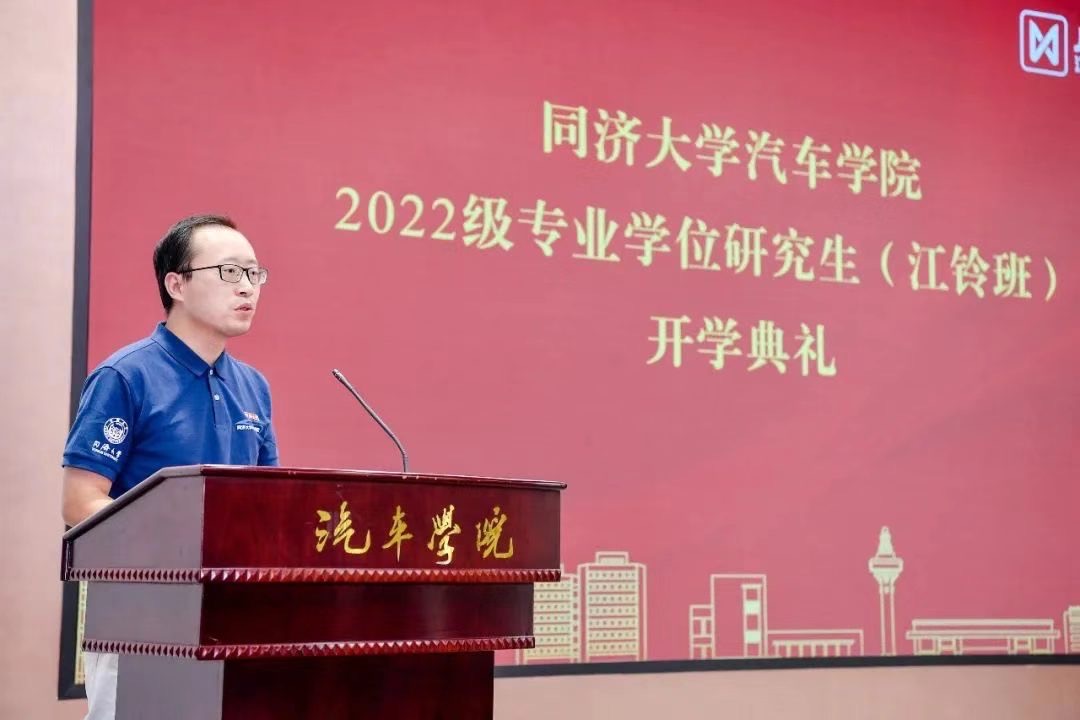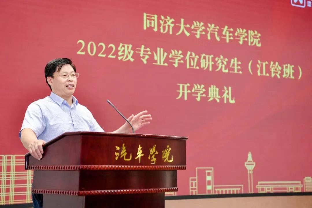 9月9日下午,同济大学汽车学院2022级专业学位研究生(江铃班)开学典礼在新能源汽车中心二楼报告厅举行。江铃集团党委书记、董事长邱天高,江铃集团党委副书记谈政,江铃集团党委常委、董事、副总经理衷俊华,江铃集团副总经理李小军,南昌智能新能源汽车研究院院长楼狄明,副院长王峥、刘年风,同济大学研究生院副院长刘春,同济大学智能型新能源汽车协同创新中心主任余卓平,汽车学院党委书记曹静,院长张立军,党委副书记葛畅,副院长赵治国、熊璐、吴旭东以及来自江铃汽车集团有限公司、南昌智能新能源汽车研究院、同济大学汽车学院的相关领导嘉宾出席。汽车学院副院长赵治国主持典礼。